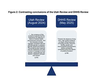 “The Utah Review concluded at page 90-91 that, “the consensus of the evidence supports that the treatments are effective in terms of mental health, psychosocial outcomes, and the induction of body changes consistent with the affirmed gender in paediatric gender dysphoria patients. The evidence also supports that the treatments are safe in terms of changes to bone density, cardiovascular risk factors, metabolic changes and cancer. … it is our expert opinion that policies to prevent access to and use of GAHT for treatment of gender dysphoria in paediatric patients cannot be justified based on the quantity or quality of medical science findings or concerns about potential regret in the future, and that high-quality guidelines are available to guide qualified providers in treating paediatric patients who meet diagnostic criteria”.
